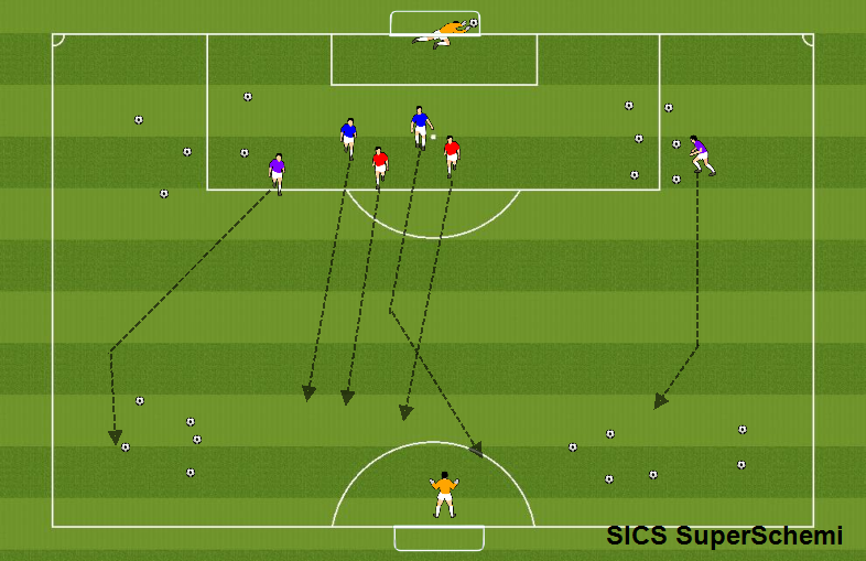 Finita questa prima azione, il giocatore viola di sinistra correrà immediatamente verso uno dei palloni in basso (vedi figura sotto) per crossare per gli stessi giocatori (blu attaccanti e rossi difensori) che attaccheranno la porta di metacampo.