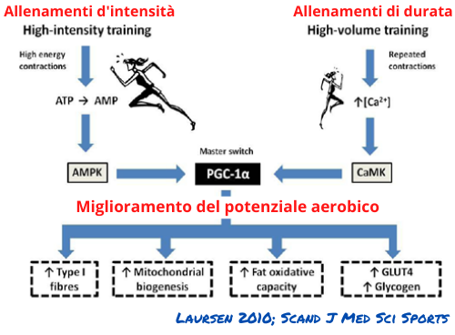 A mio parere non è così; l’immagine sotto (presa dallo studio di Laursen 2010 e modificata) spiega bene come sia stimoli di natura particolarmente intensa come di speed endurance (lato di sinistra) che di durata e bassa intensità (vedi lato di destra) possono stimolare adattamenti di natura aerobica.
